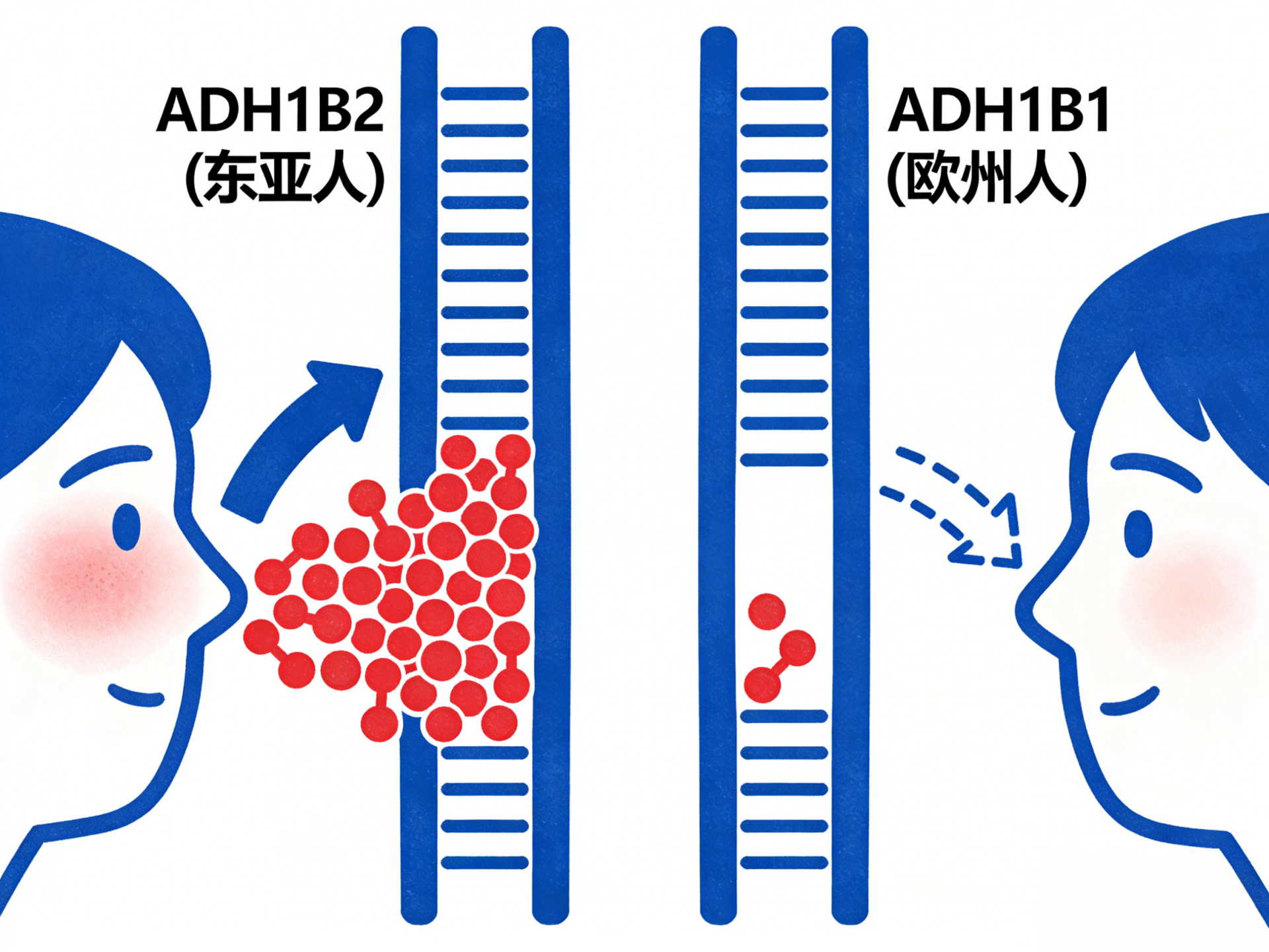 ADH1B基因掌管着酒精代谢的第一步。不少东亚人携带ADH1B2突变基因,这种基因能让乙醇脱氢酶的活性飙升40到100倍。这就意味着酒精会被飞速转化成乙醛,一旦后续的分解步骤跟不上,乙醛就会在体内堆积,让人瞬间变成“红脸关公”。而欧美人更常见的是ADH1B1基因,这种基因对应的酶活性较慢,乙醛产生得少,自然不容易出现不适反应。